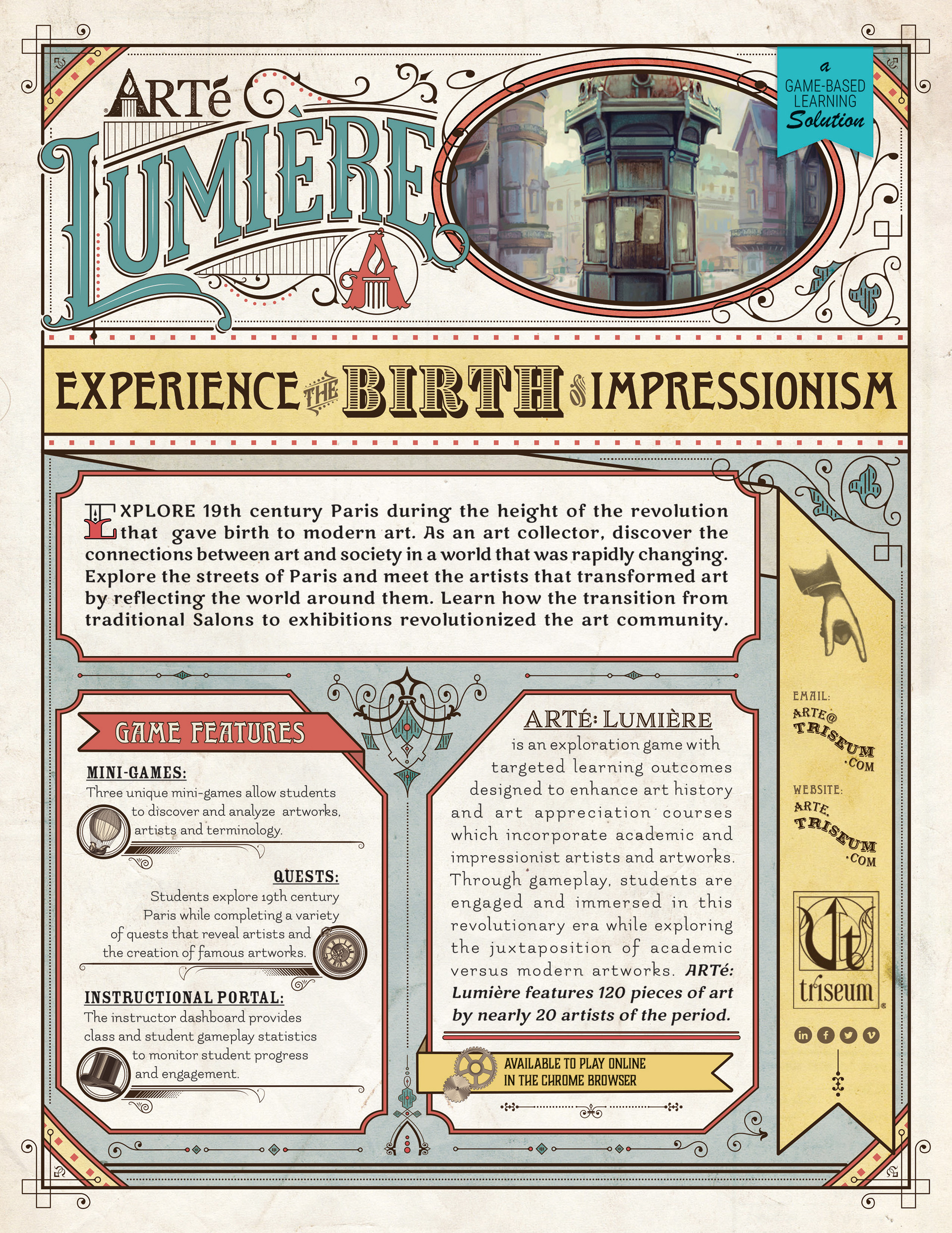ARTé: Lumière was conceptualized at Texas A&M's LIVE Lab in partnership with Triseum, to be part of our ARTé series. While games in the series share the same general subject matter (art history and art appreciation), each game is uniquely designed to present and enhance the educational content. With a similar timeline as Mecenas but more complex design, Lumière required a lot of initial review and planning to determine the best path to success.